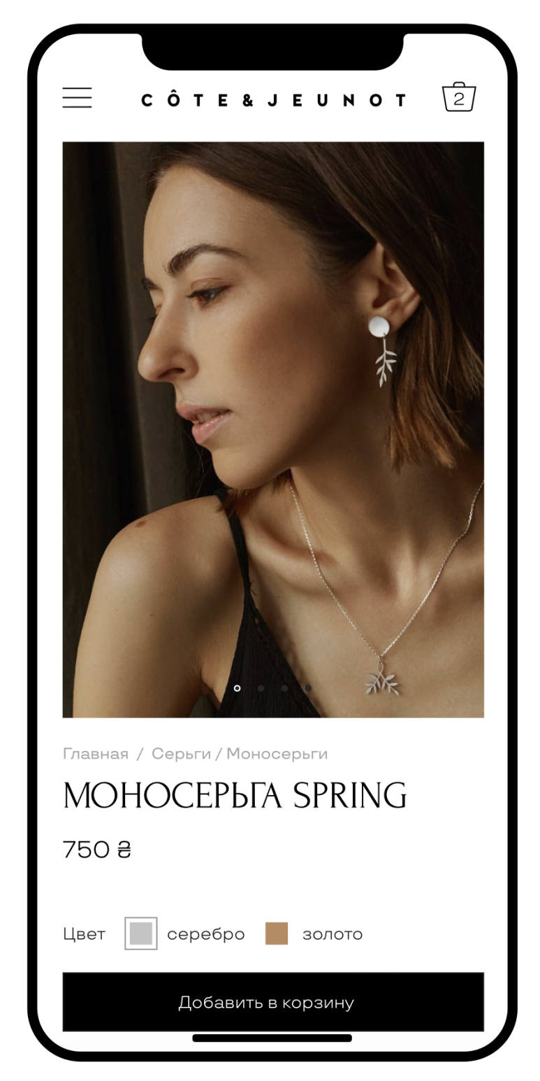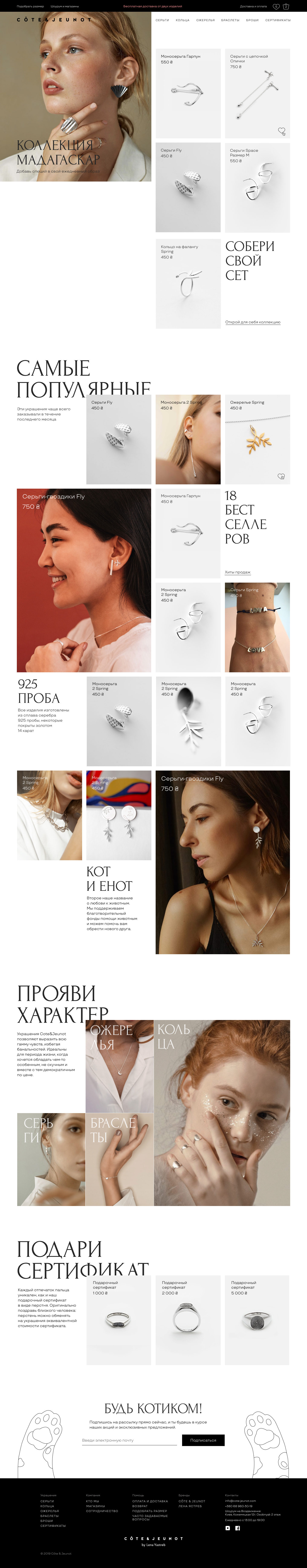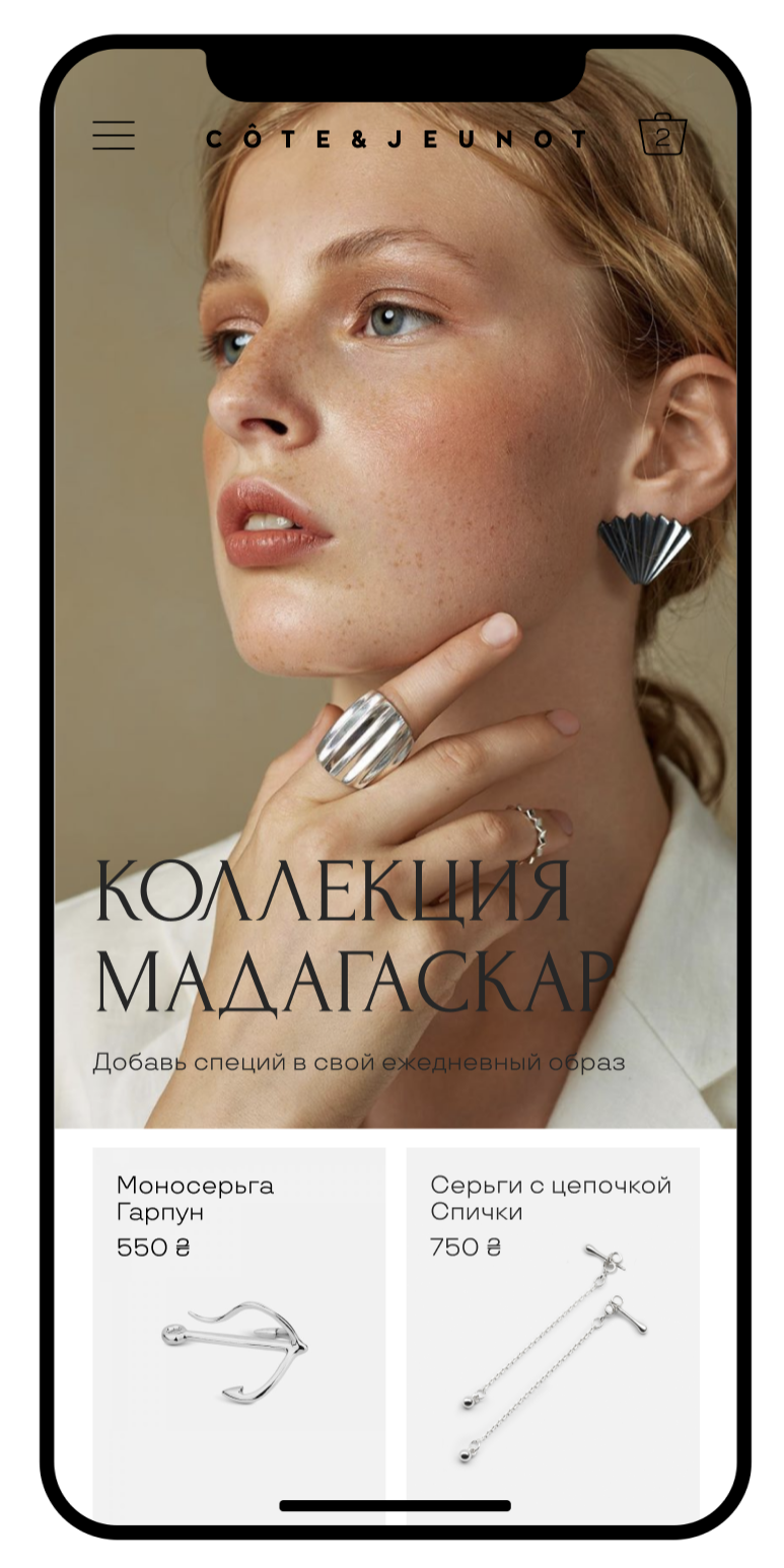 Cote & Jeunot ukrainian jewelry allows you to express the whole variety of feelings, avoiding platitudes. Ideal for a period of life when you want to have something special, not boring and at the same time affordable in price. The main idea is to make the home page more functional and to immediately introduce customer/web page visitors to the brand and assortment.