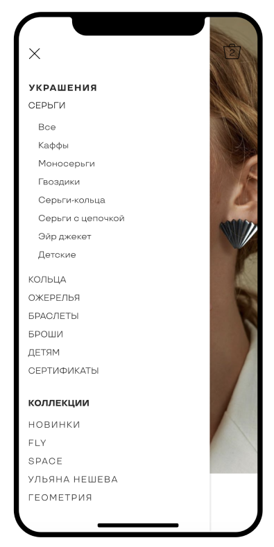 I added a detailed menu that helps to understand a large assortment and quickly find a product. In order to control attention, I show 80% of the products in the catalog on a gray background, and only where I need emphasis I show jewelry on a person.
